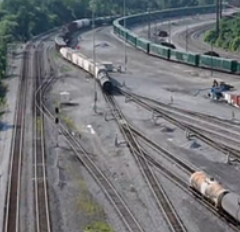 The hump in Cumberland is replaced with a mini-hump and switching with modern freight cars having roller bearing still allows cars to roll into classification tracks. A small shack accommodates an operator who aligns switches using a modern APEX Rail Automation system and an operator for uncoupling cars at the mini-hump and controlling the loco remotely.